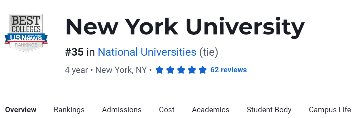 在2024 US News 美国大学排名中,NYU大学排名第35位。
