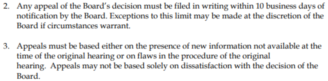 在收到 克拉克大学 处分通知的10个工作日内学生可以以书面形式递交申诉。在以下情况可以提出申诉:在听证会后有新的相关证据;处理过程错误或判罚过重。根据申诉的原因,处理申诉的人员有所不同。