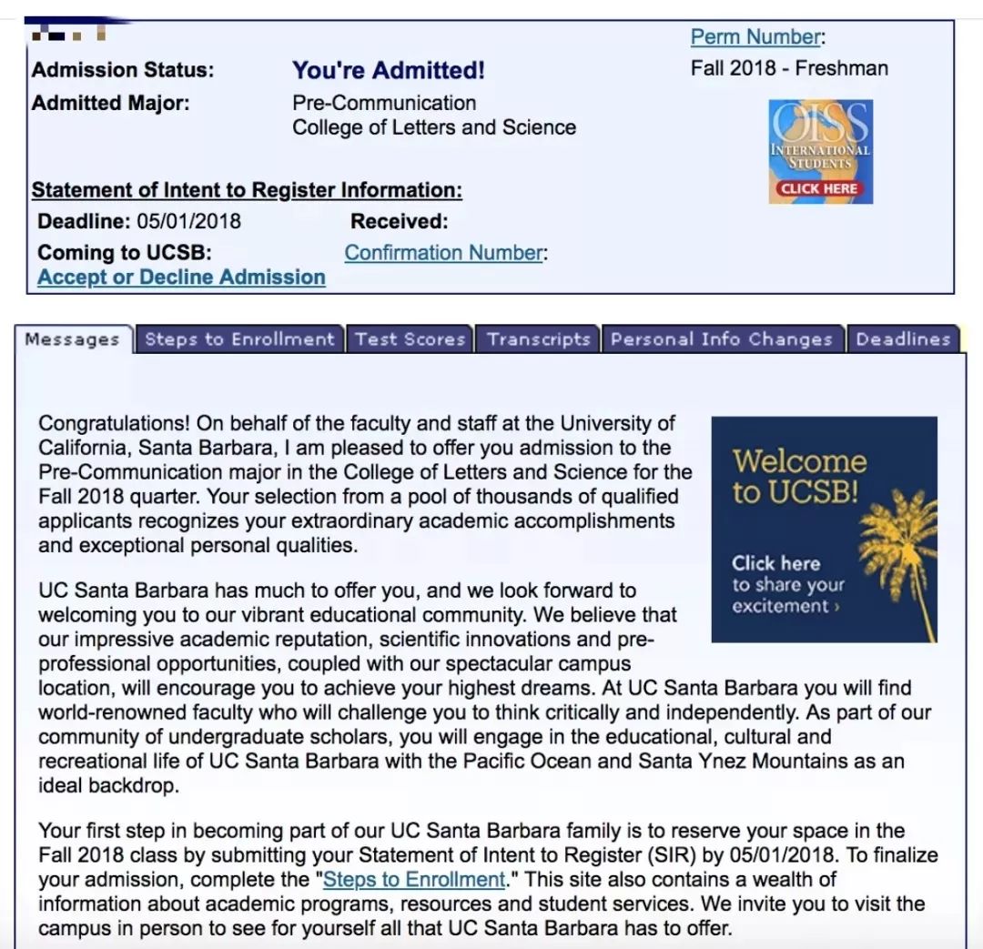 因此,虽然L同学的托福成绩才80多,但在shiyu老师、厚仁文书老师和L同学的共同努力之下,L同学收获了UCSB和PSU等三个学校的offer!恭喜L同学!
