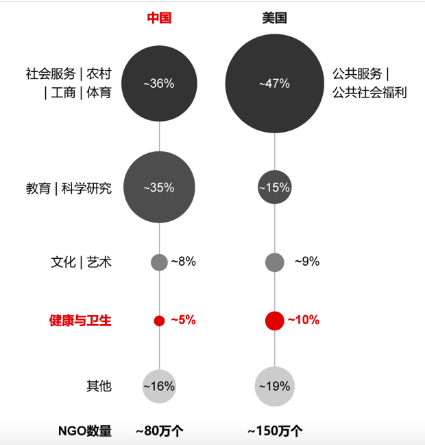 相较于美国,中国80万个NGO中,与公共卫生相关的仅占约5%。在后疫情时代,国内NGO的发展将会结合国外NGO的经验和本次新冠疫情的实践,完成多元方向发展的升级。