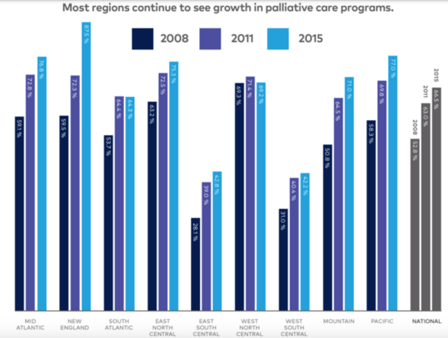 根据美国舒缓治疗中心CAPC数据统计显示,自2008-2015年起,全球提供舒缓治疗的医院和非营利机构呈现逐年递增的态势,而英国已在2015年达到了87.5%的增速,而美国在过去12年的增速也达到了164%。根据2010年《新英格兰医学杂志》报道显示接受早起舒缓治疗/姑息治疗的患者的患抑郁症概率大幅降低,且生活适量得到改善,并可使患者寿命延长2.7个月。如果舒缓治疗进入所有的医院,可每年节省60亿美元,在美国有超过61%的医院设有专门的舒缓治疗部门。