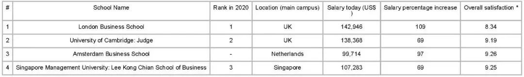 贾奇商学院紧随其后,毕业三年后的校友平均薪资超过138,000美元。荷兰阿姆斯特丹商学院为新上榜院校。