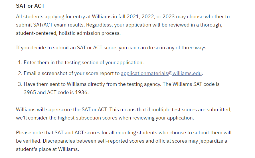 威廉姆斯学院称所有申请2022年或2023年秋季入学威廉姆斯学院的学生可以选择是否提交SAT/ACT考试成绩。无论如何,你的申请将在一个彻底的,以学生为中心的,全面的录取过程中被审查。