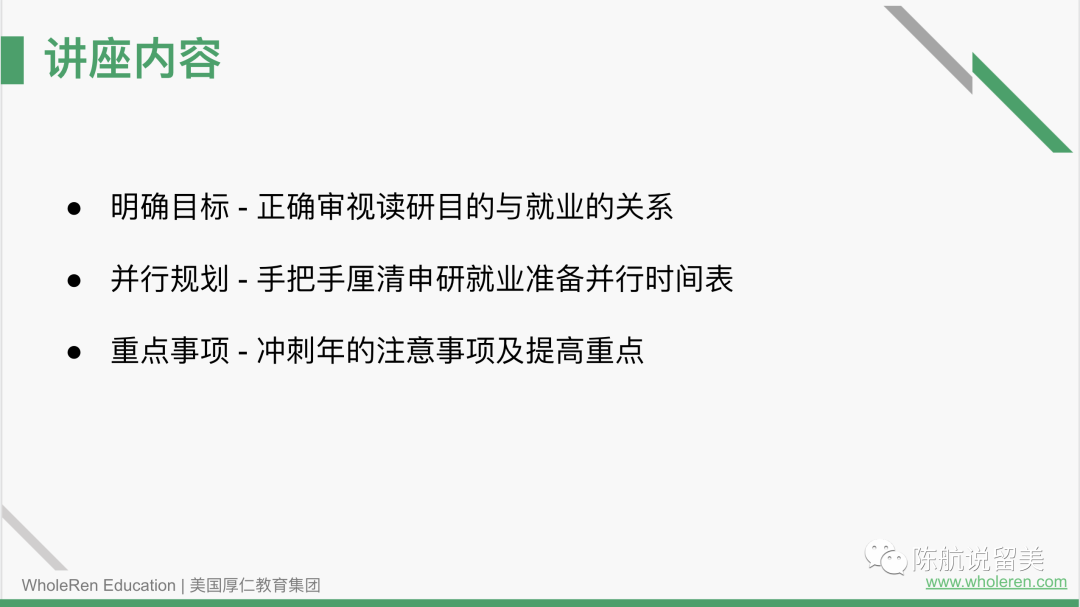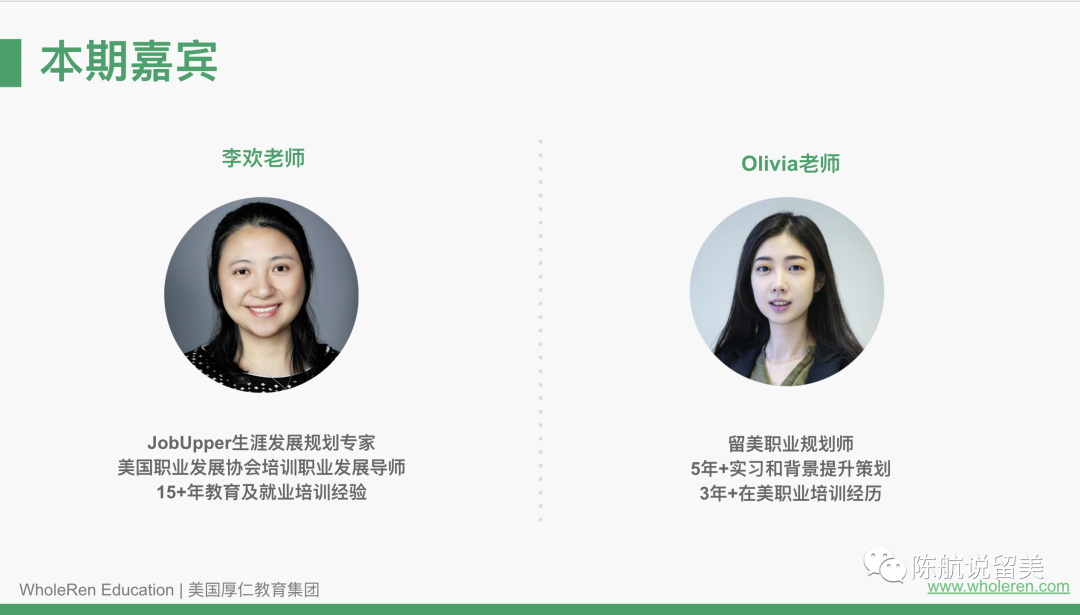 感谢各位家长同学观看上周《大四关键年申请+OPT就业准备详解》讲座,本次讲座的特邀嘉宾李欢老师和Olivia老师是生涯发展规划专家。三位老师携手为大家讲解高年级学生该如何做出正确规划。