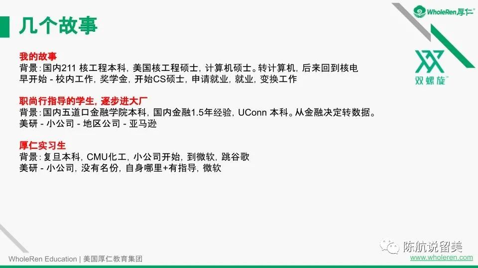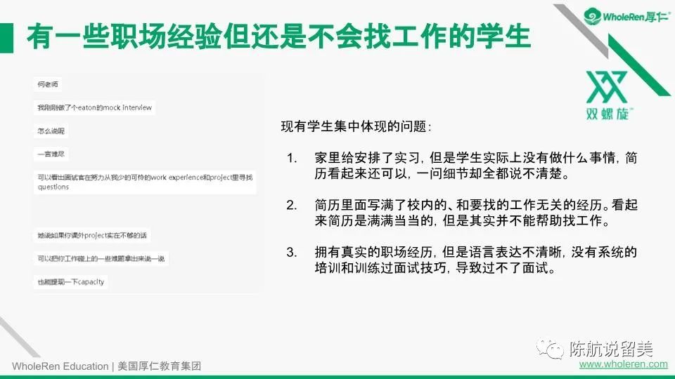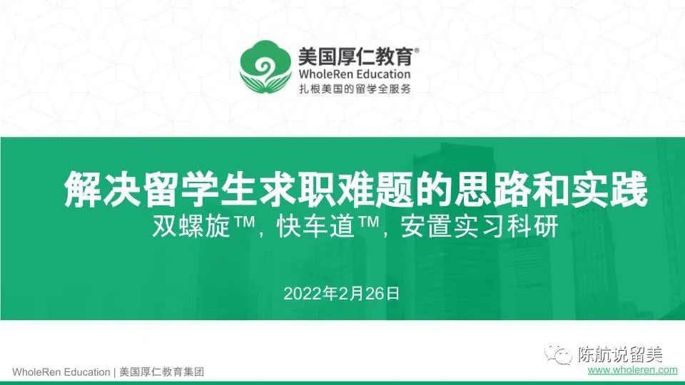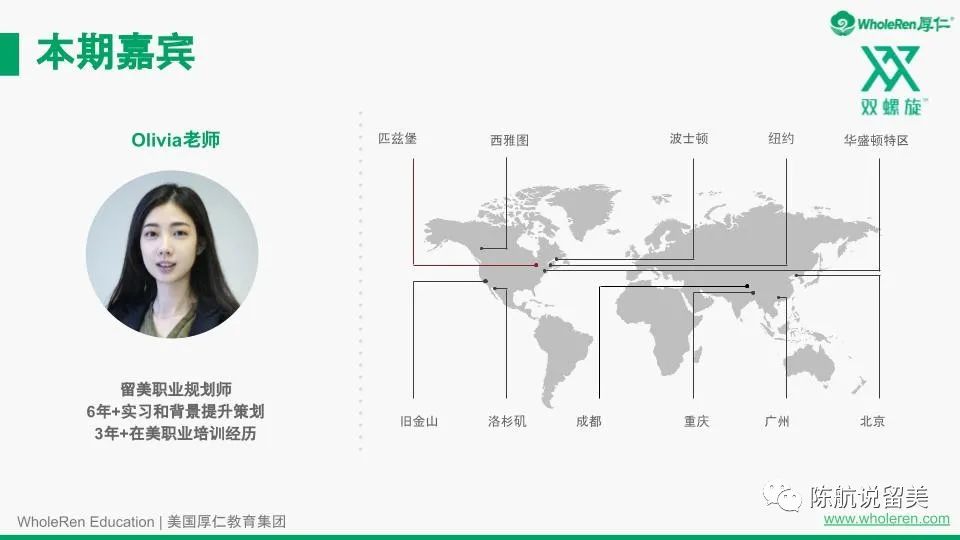 感谢各位家长同学观看2月26日的《求职快车道™–解决留学生求职难题的思路与实践》讲座,本次讲座特邀厚仁留美职业规划师–Olivia老师作为嘉宾,和陈航老师一起为大家分享成功经验与专业知识,解决大家在求职过程中的难题。