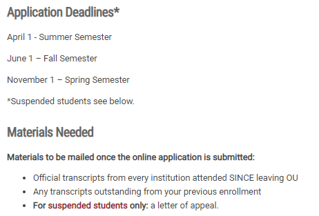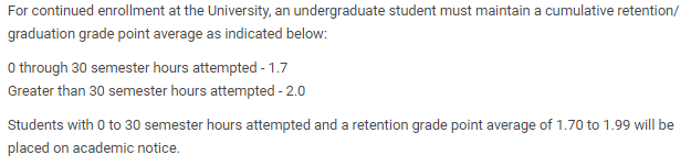 俄克拉荷马大学采用通用的GPA算法。学校与大多数美国高校一样,要求在校的本科生必须保持Cumulative GPA在2.0或以上。而对于未修满30个学分的新生,则要求保持累积GPA在1.7或以上。对于成绩在1.70到1.99的新生,学校会给予Academic Notice。该notice类似学术警告,提醒学生要抓紧提高自己的学术成绩。