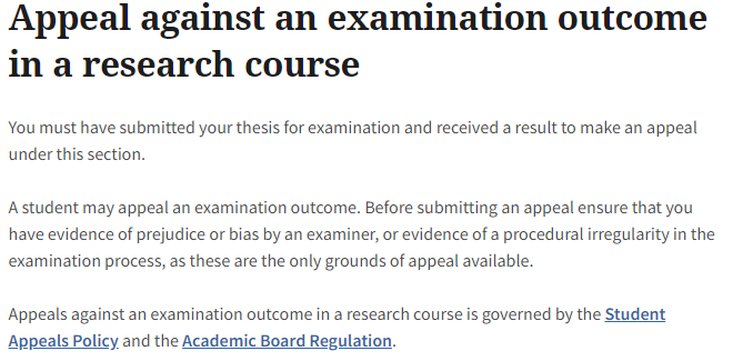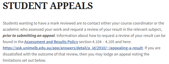 墨尔本大学保证每一位学生的学术成绩都公平公正。如果学生对自己的课业成绩有异议,认为存在成绩错误或者不公平的行为时,学生有权利提出成绩申诉(Grade Appeal)。