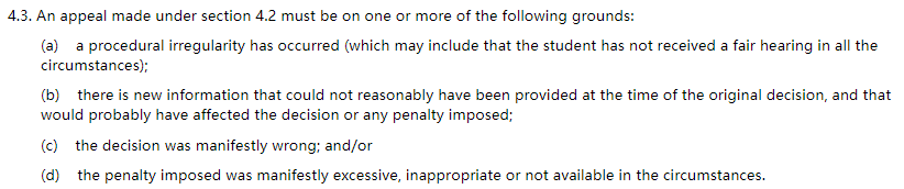 对于学术不诚信行为的处罚,学生有申诉的权利。学生可以在收到判罚决定的20个工作日内,提交书面申诉。学生的申诉必须基于以下几种理由:
