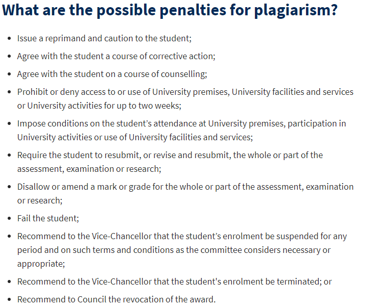 根据学生的学术不诚信行为严重程度和学生的过往诚信记录,学校会给予相应的处罚。如果学生是初次犯错,且学术不诚信行为较轻,则处罚通常以教育为目的。类似的处罚有课业0分,课程成绩处罚或挂科等。如果学生不知悔改或者犯错情节严重,则会面临较为严重的处罚。类似的处罚包括但不限于停学或开除的处分。