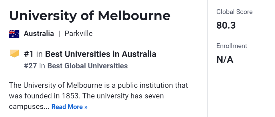 2024年,墨尔本大学位列U.S. News全澳第1、世界第27位。
