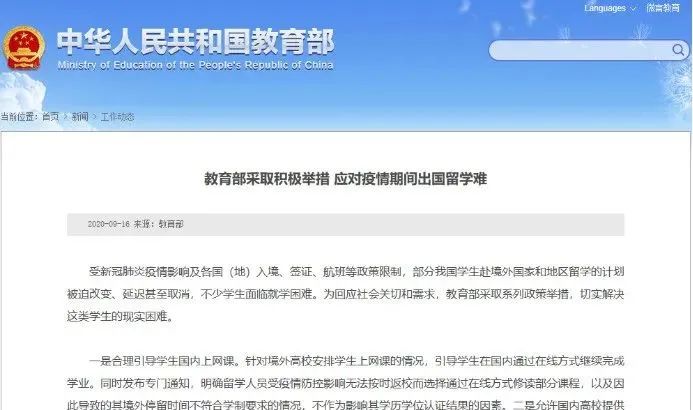 教育部9月16日发布消息称,受新冠肺炎疫情影响及各国(地)入境、签证、航班等政策限制,部分我国学生赴境外国家和地区留学的计划被迫改变、延迟甚至取消,不少学生面临就学困难。为回应社会关切和需求,教育部采取系列政策举措,切实解决这类学生的现实困难。