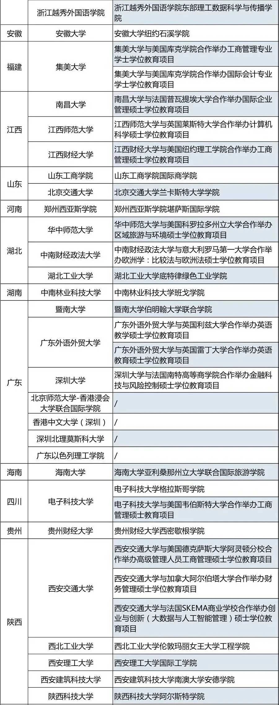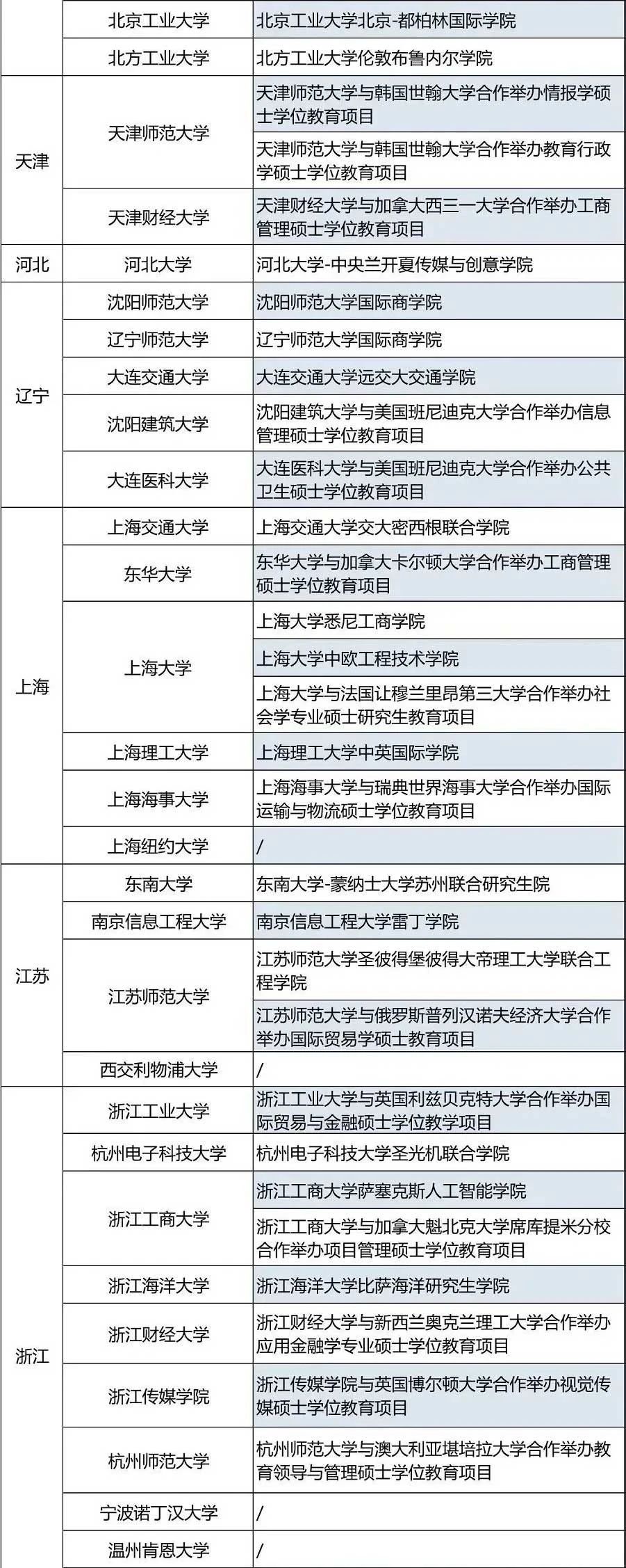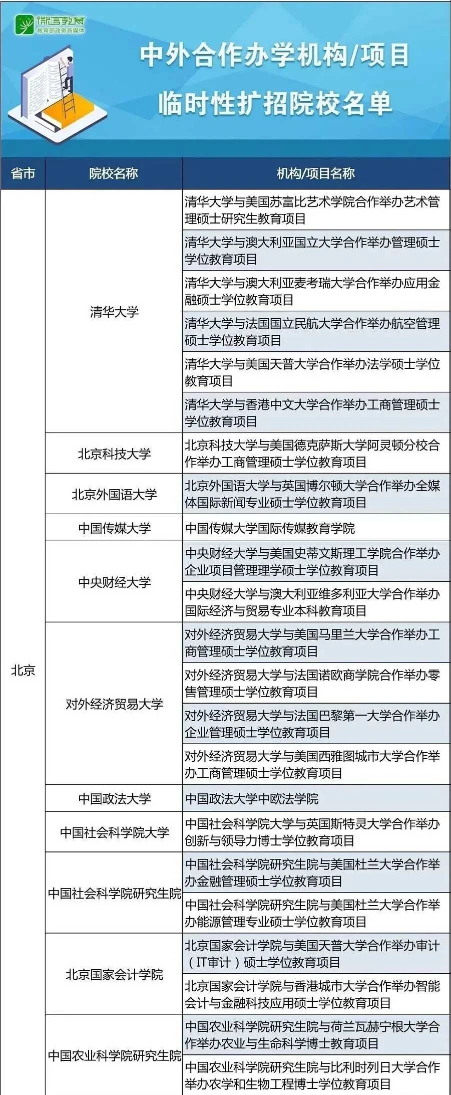 北京、浙江、广东等19个省市的约90个中外合作办学项目,以及以及内地(祖国大陆)与港澳台地区合作办学机构和项目都被允许扩招,在双向选择、择优录取、保证质量的原则下,接受留学生就读。