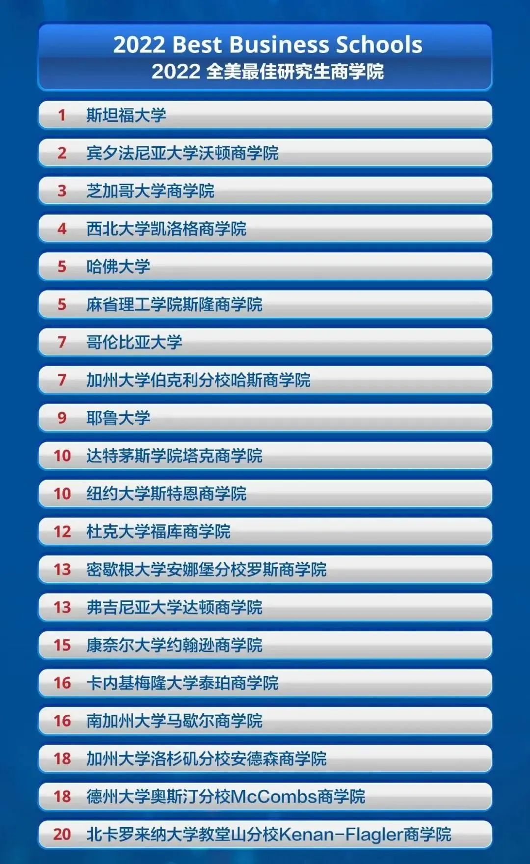 研究生商学院M7难以撼动。商学院排名中,斯坦福大学位列第一,宾夕法尼亚大学沃顿商学院排名第二;芝加哥大学与西北大学互换了位置,分列第三、第四名;弗吉尼亚大学下降3位,至全美第13位,与密歇根大学并列。