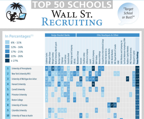 而关于Target school的排名和争议,很多机构也给出了自己的排行,比如WSO(Wall Street Oasis)的投资银行报告显示,在高盛(Goldman Sachs)、摩根大通(JPMorgan Chase)等顶尖投行中,宾夕法尼亚大学、纽约大学、密歇根大学、哈佛大学、康奈尔大学、普林斯顿大学等都名列前茅,稳稳的占据了Target School的宝座。