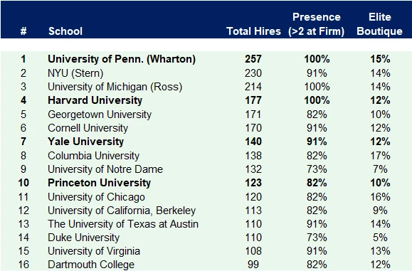 而基于LinkedIn的数据,汇总在美投资银行的分析师来看,宾大(沃顿)、纽大(斯特恩)、密歇根大学(罗斯)、哈佛大学也依旧是投行的最爱。