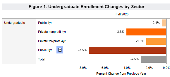 不同于专家预测的“经济衰退期间,社区大学入学人数增加”的趋势,报告显示受影响最大的就是社区大学,入学率下降了7.5%;公立四年制大学的降幅最小为0.4%。