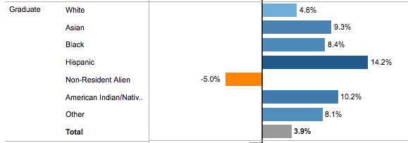 所有种族和族裔家庭学生的研究生入学率都有所增长,其中西班牙裔增长14.2%,美洲印第安人/美国原住民 增长10.2%,亚裔增长 9.3%。而参加研究生课程的黑人学生人数增加了8.4%。