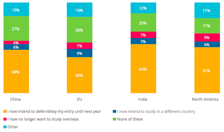 而QS发布的《2020年留学白皮书》数据也显示,疫情之下仅有不到7%的国际生放弃留学;其中,中国留学生仅有4%放弃留学,48%的中国留学生选择defer延期入学以规避风险。