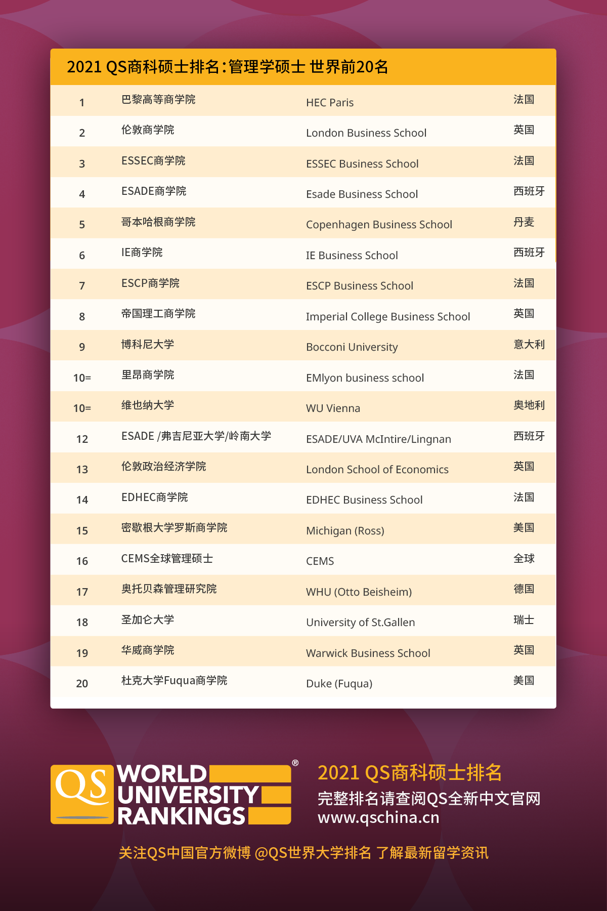 最近的排名真不少啊,近日,全球高等教育和商科教育研究机构 QS (Quacquarelli Symonds )发布了2021QS全球商业硕士排名!QS是目前世界最具影响力的四大排名之一,商科则是吸引最多留学生申请的三大专业领域之一,由此可见,这项排名确实值得同学们期待~