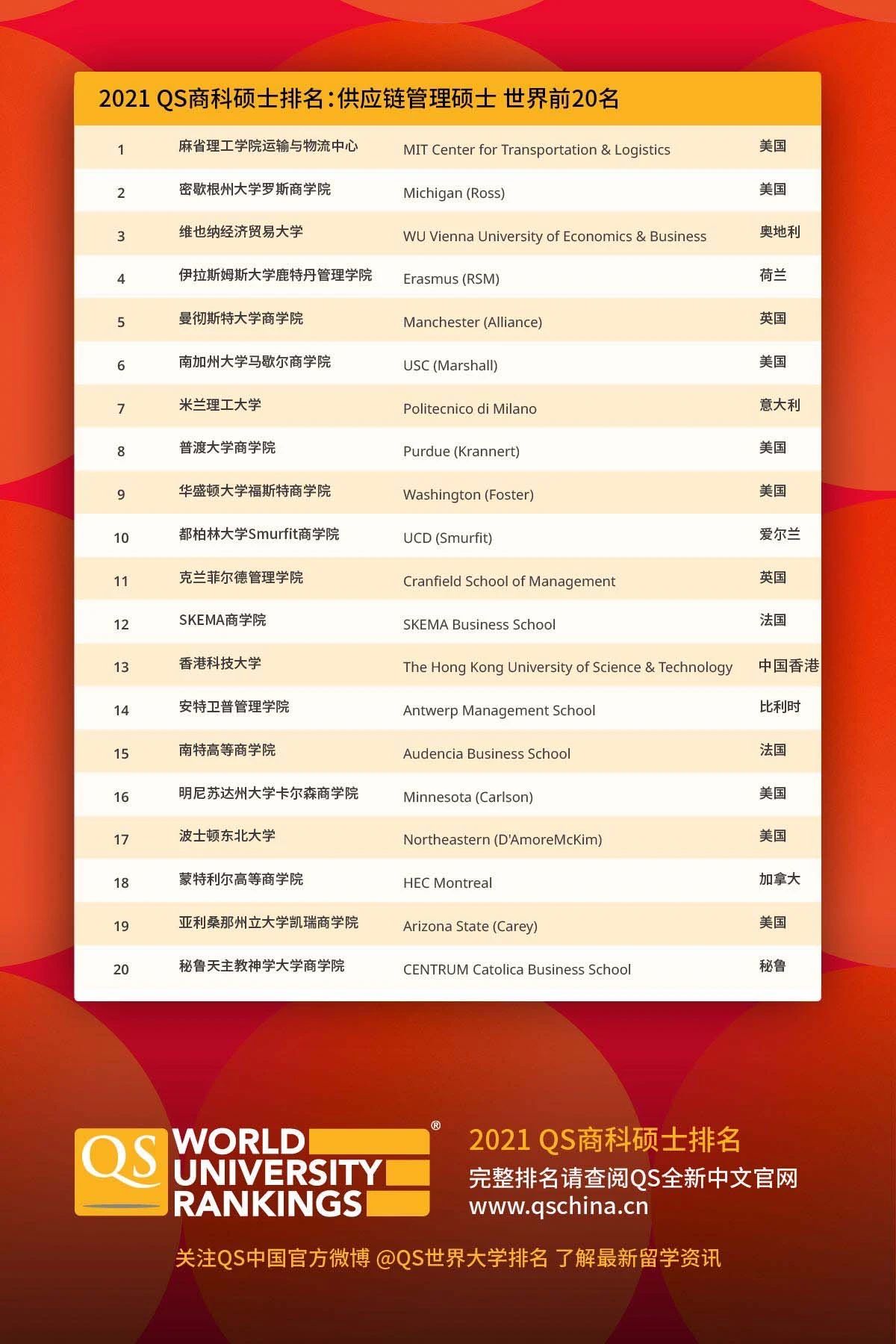 对于今年首次发布的 QS 供应链管理硕士排名,QS 的首席执行官 Nunzio Quacquarelli 表示:“无论是现今最受关注的研发新型冠状病毒疫苗的公司,还是自电子商务开始流行以来快速增长的电商企业,世界各地的公司都在招聘专门从事供应链管理的人才。”