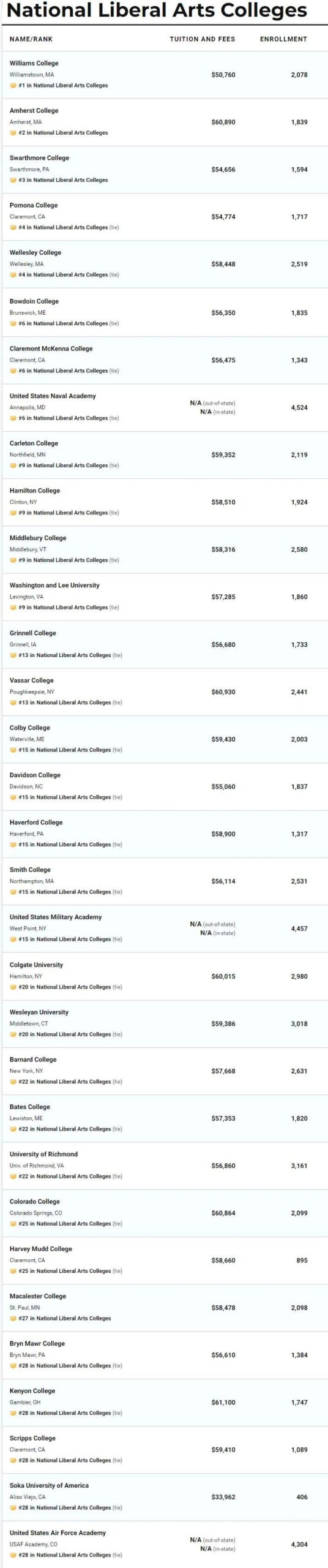 与综合大学相比,文理学院的排名稳定许多,威廉姆斯学院、阿默斯特学院、斯沃斯莫尔学院排名没变,依旧牢稳占据三甲,仅仅韦尔斯利学院下降了一名。与波莫纳学院并列第四。
