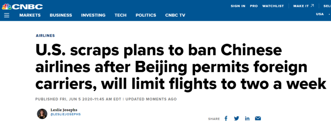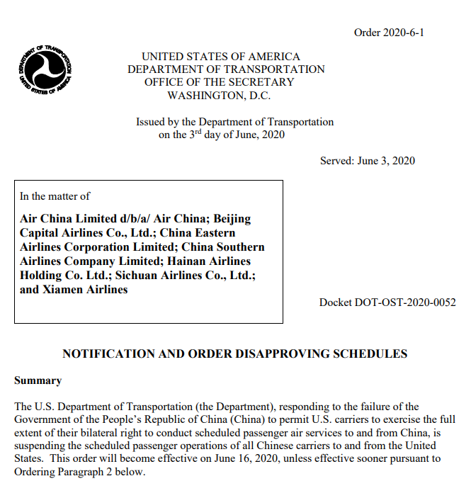 而美国交通部DOT随后便正式宣布,因中方没有允许美国航空公司提供往来中国的服务,美方将暂停允许中国航空公司提供来往于美国的航班,相关规定从当地时间6月16日开始执行,但如果总统下令,该政策随时可以提前实行。