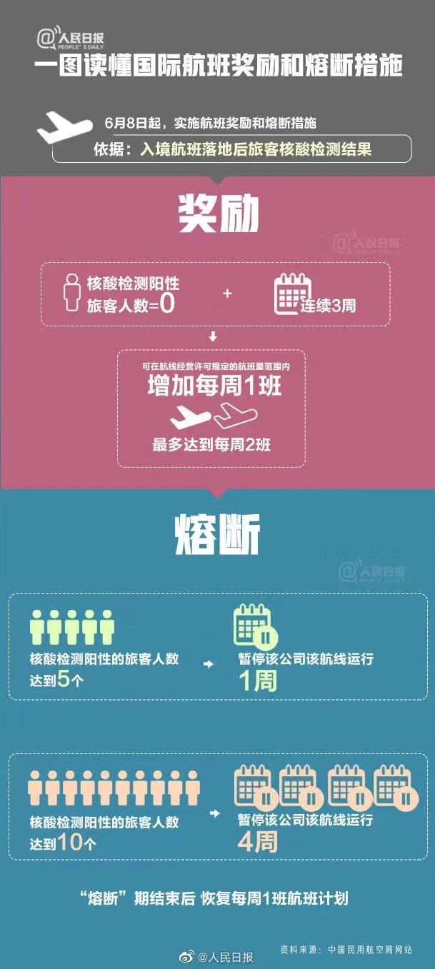 三、自2020年6月8日起,以入境航班落地后旅客核酸检测结果为依据,对航班实施航班奖励和熔断措施。