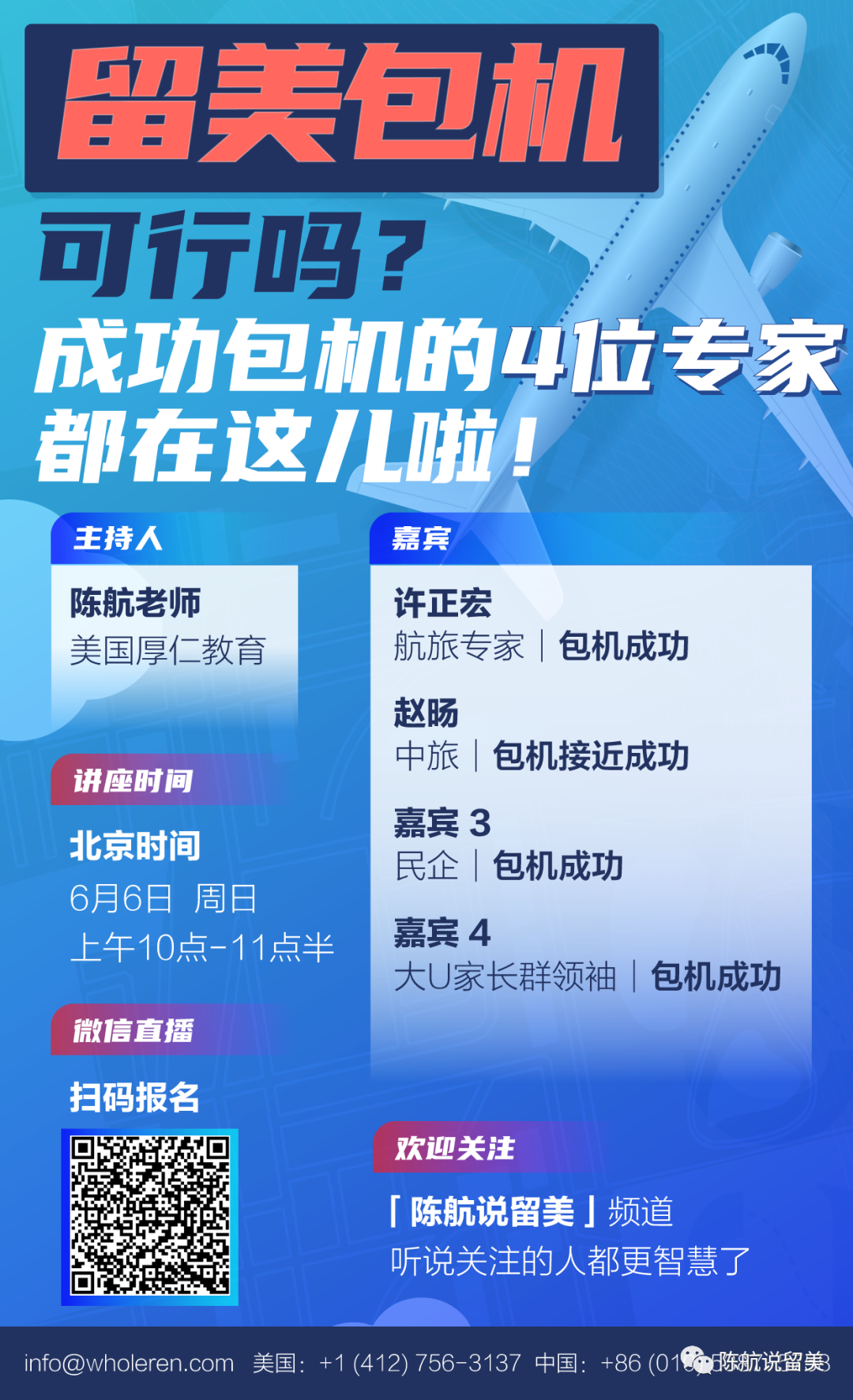 因为我也是美国NAFSA中国专委会的副主席,有必要的话,我也会协调和通知美国的大学校方,政府机构等。近日以来,通过协调包机,了解家长和学生的需要,我和同事深深感到,学生此次安全成行不易。所以,特别在北京时间周日上午10点,举办“包机和安全赴美讲座”,请到了四位重量级嘉宾,三位包机成功,一位包机接近成功。其中一位是美国大U家长群领袖以外,其余三位都是旅行行业优质企业,在顺利成行方面,也能帮助大家。