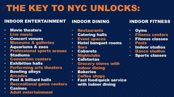 所以大家注意啦!作为“解锁纽约计划”(Key to NYC)的一部分,即日即刻起,纽约市将要求民众进入包括餐厅室内区域、娱乐场所、健身房等室内公共场所时,需要出示至少一剂的疫苗接种证明!