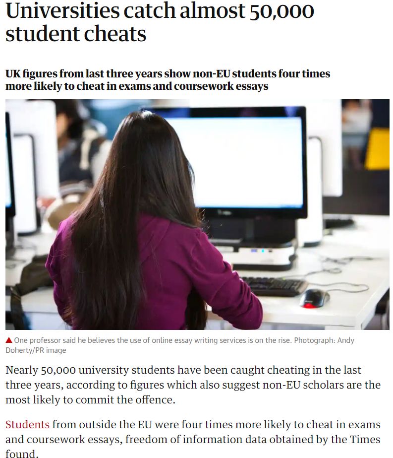 英国《卫报》报道,英国最新数据显示,2013-2015年,共有50,000学生被曝犯有考试 作弊 的行为。其中,非欧盟学生考试平均作弊的次数是欧盟学生的4倍多。呃~矛头这是指向了我们留学生吗?虽然是过去几年的数据了,但是近些年留学大国频频爆出集体作弊、商业作弊等丑闻。其中这些作弊的新闻中几乎都能牵扯到留学生,真是让人无奈。