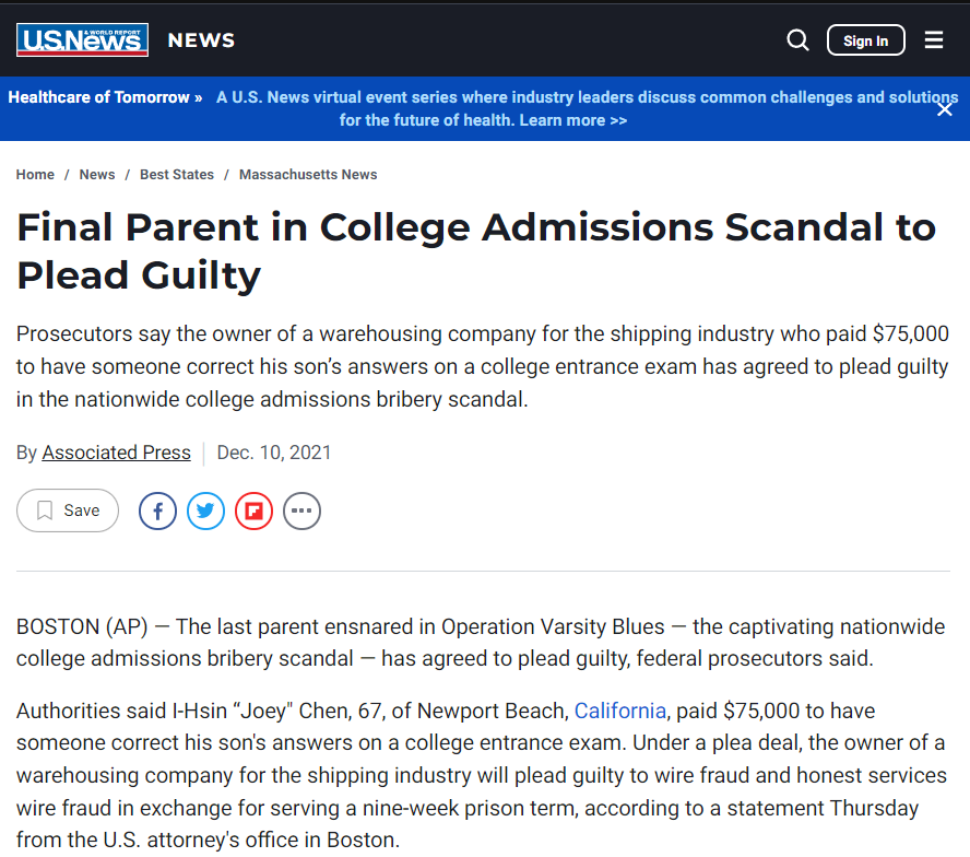 19年土豪们花巨额为孩子上名校“买门票”事件闹得人尽皆知,其中不乏有华裔父母为孩子花钱走后门……今年,最后一名涉事家长认罪了,并获得了9周的刑罚以及缴纳罚款的处理结果。