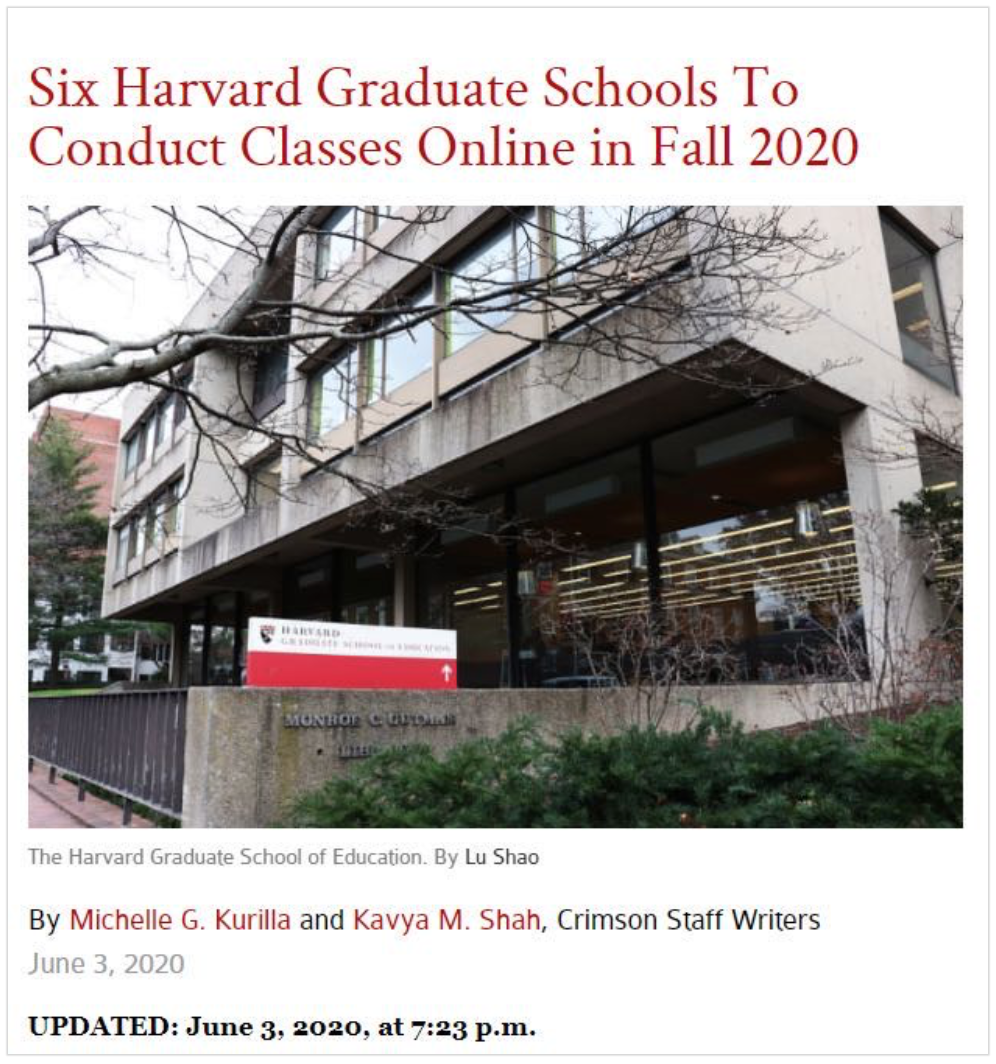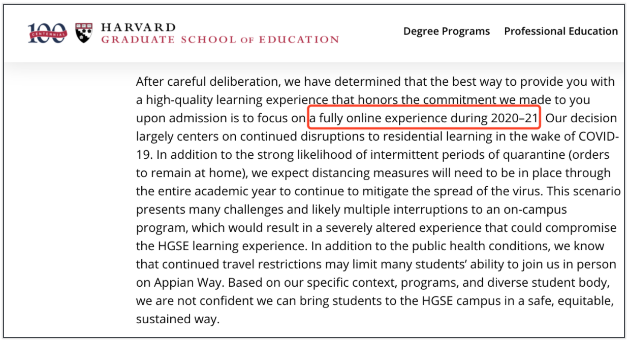 因此在面临开学还是不开学的抉择之时,哈佛大学教育学院决定——2020-2021学年,全部改为线上课程,不再进行面对面授课。
