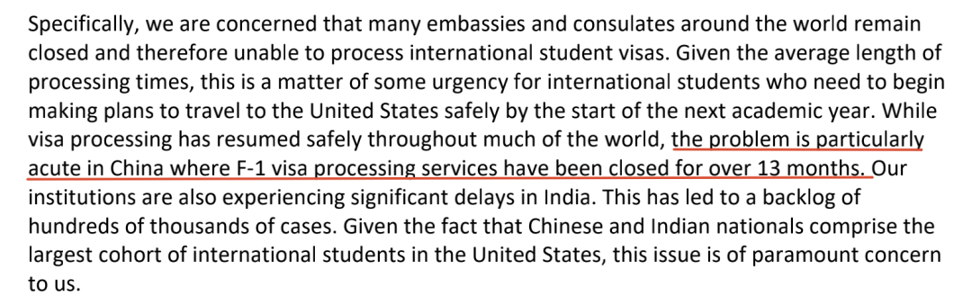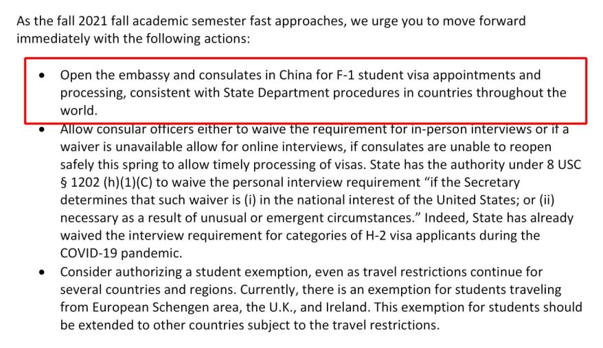 在17所高校的联名上书中,讲了国际学生对于美国高校的重要意义之后,指出现在美国在全世界各地的使领馆处于关停或者半关停状态。鉴于办理F1签证的手续和时间周期,如果要确定国际学生能够在2021年秋季赴美留学,现在恢复F1签证业务是当务之急!