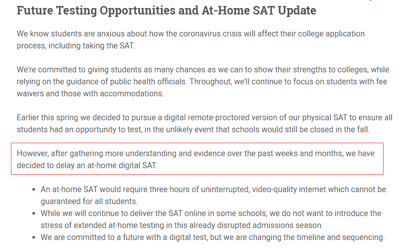 但现在CB决定延缓该项决定。主要原因是:考虑到远程家庭版SAT考试要求用网络进行连续3小时不间断的视频连线,也并不是所有学生都具备硬件条件。不过,CB也表示将来有可能会进行SAT网考,具体时间安排待定。