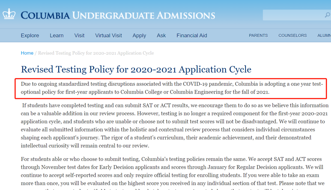 “ 由于新型冠状病毒(COVID-19)大流行导致的标准化考试中断,哥伦比亚大学将对申请哥伦比亚学院(Columbia College)或哥伦比亚工程学院(Columbia Engineering)的新生实行一年可选考试政策,时间为2021年秋季。”