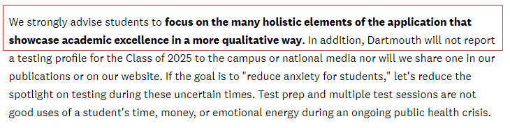 紧接着,另一所私立八大常春藤联盟之一—–达特茅斯学院(Dartmouth College)也提出实行一年不要求SAT/ACT成绩的考试可选政策(Test-Optional)。