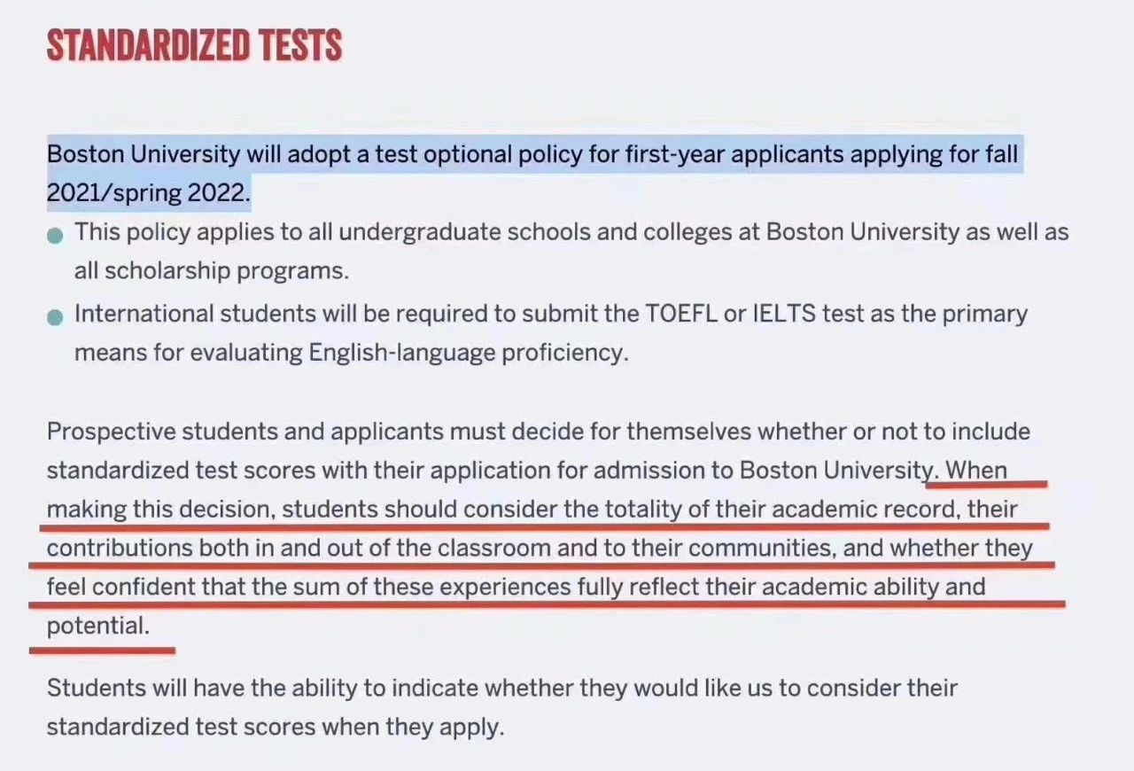 5.波士顿大学宣布,将为2021年秋季和2022年春季申请的学生提供test optional,但这个政策只适用于这两个学期,之后将被取消。