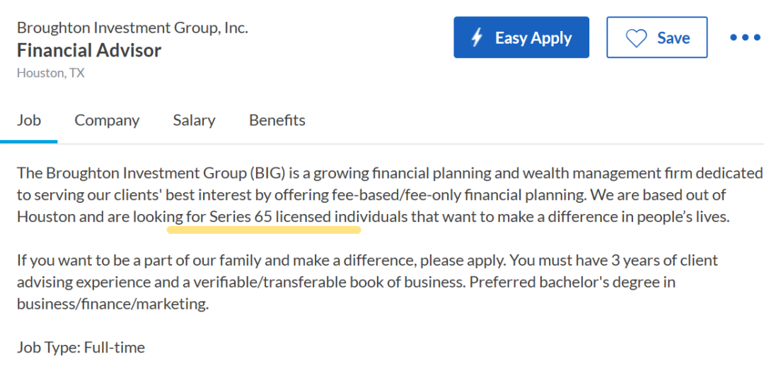 Series 65:任何希望提供金融类建议或提供无佣金基础服务的人,均须持有Series 65执照,包括提供投资建议并按时薪收费的理财规划师和顾问,以及股票经纪人和其他管理 managed-money accounts的注册代理人。该执照考试时长180分钟,内容包括注册投资顾问的相关规章制度,以及各类投资工具、投资纪律、经济学、道德和分析。