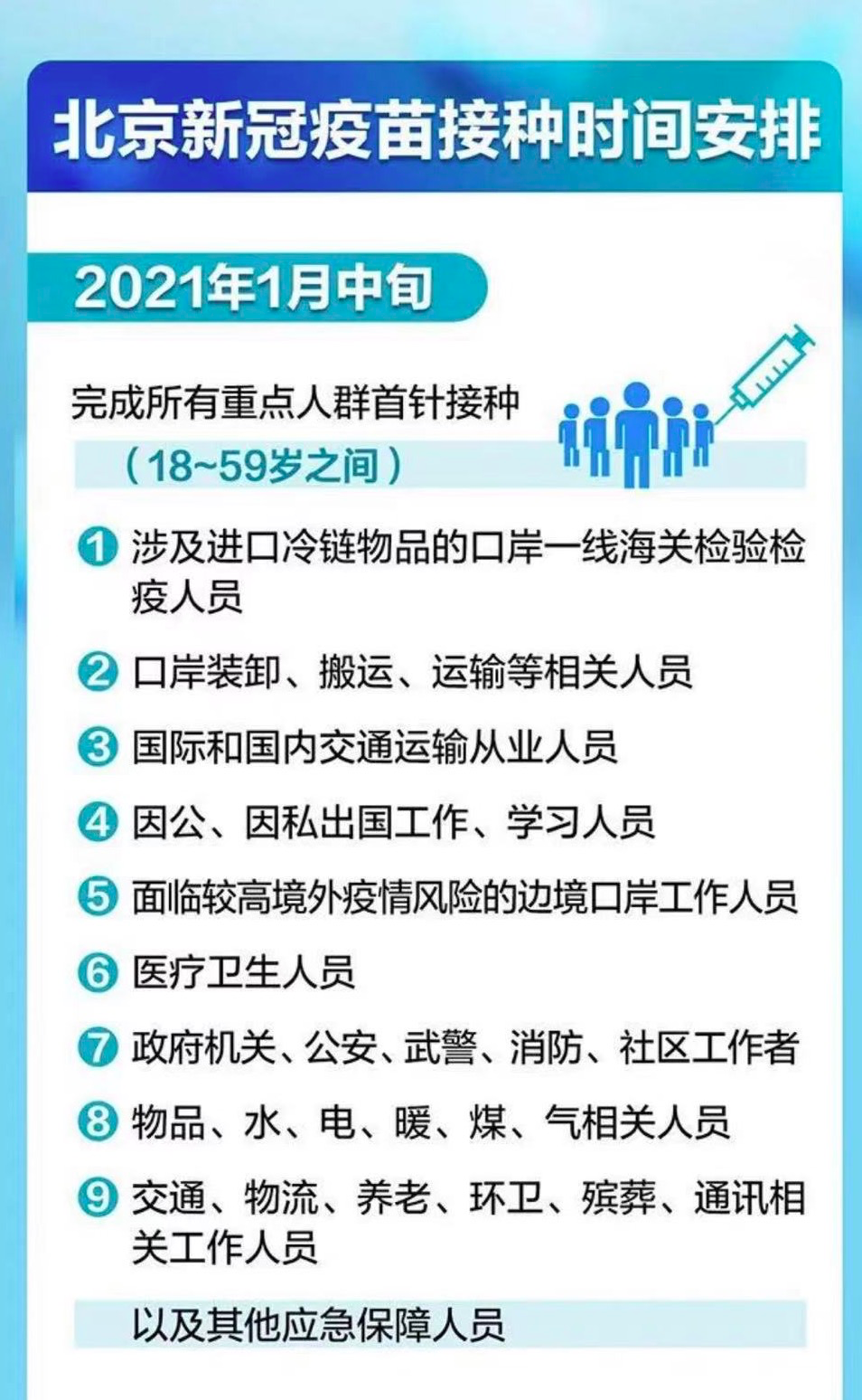 北京公布了新冠疫苗接种时间表,计划在2021年1月中旬完成所有重点人群首针接种,春节后其他人群开展接种。