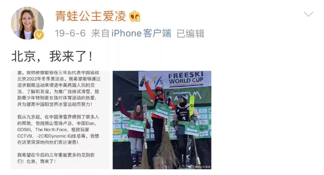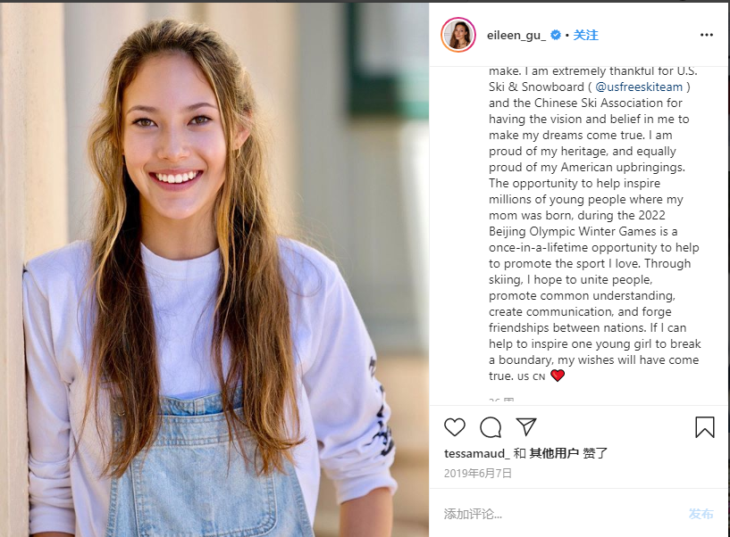 其实谷爱凌是突然走红的。走红的时间点是2019年6月,她在微博上宣布加入中国国籍,将代表中国征战2022年北京冬奥会。