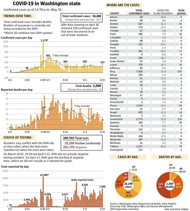 华盛顿州到今天为止的数据和曲线,显示至今有18288个确诊案例。