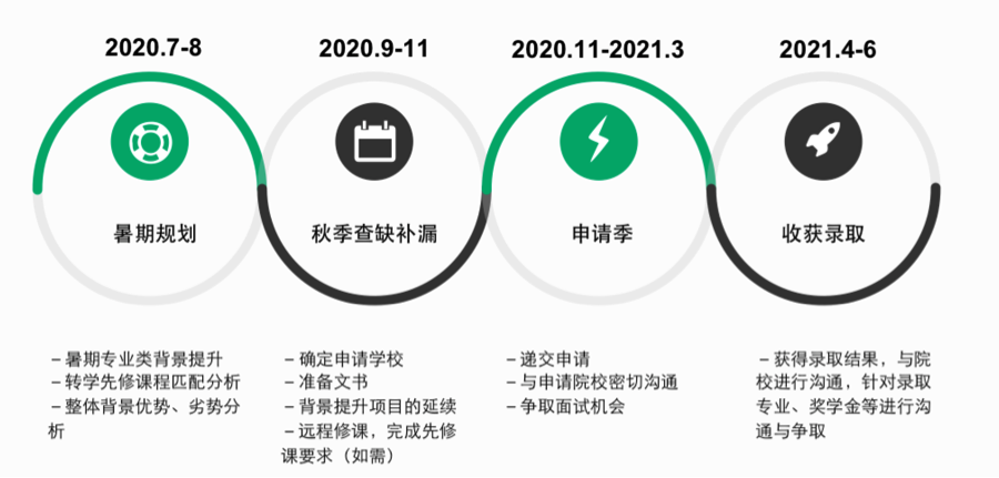 下面我们会针对不同年级,背景条件不同的学生情况,进行一个分类说明,如何进行合理时间安排,进行转学申请。