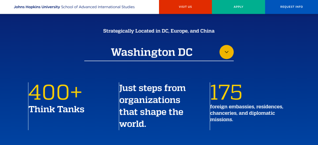 约翰·霍普金斯大学高级国际研究学院(SAIS)地处美国政治中心——首都华盛顿特区,坐拥独特的地缘优势,与世界一流智库布鲁金斯学会、卡内基国际和平基金会仅隔一条马路,并与全球发展中心、彼得森国际经济研究所等为邻,地理位置绝佳。保罗·尼采高级国际研究学院(SAIS)是政治辩论的主要中心,曾担任多个重要的政治学家和经济学家的基地,其中包括政治经济学者弗朗西斯·福山,前国家安全顾问兹比格涅夫·布热津斯基,前美国国务院顾问艾略特科恩等,也是全美及世界公认的最顶尖国际关系学院,位列全美第一,与哈佛大学齐名,且拥有全美第一的公众关系专业。