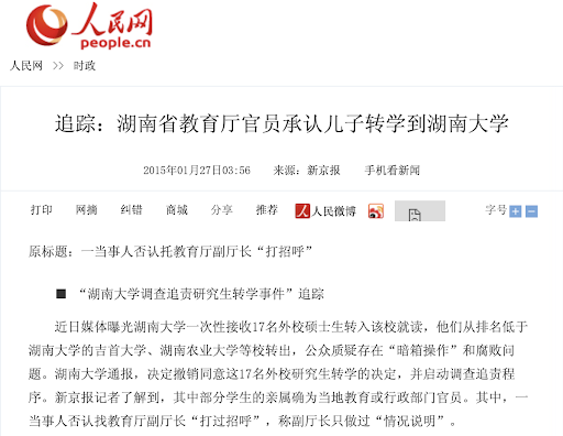 2015年,湖南大学有十几个学生转学进来,就被查出是权力腐败,直接涉及省教育厅官员孩子的学术腐败。