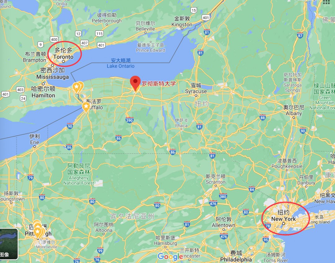 罗切斯特大学位于美国纽约州北部地区的罗切斯特市。虽说是在纽约州,但距离罗切斯特最近的大城市却不是纽约,而是在隔壁国家加拿大的多伦多。从罗切斯特飞到多伦多只要五十多分钟,去著名的尼亚加拉大瀑布车程一个多小时,所以可以算是在美加边境的一所大学。村里的同学们想要“进城”改善生活,找找家乡菜、逛逛大商场,第一反应就是出境去加拿大~而且加拿大签证办理很容易,只要准备好材料寄送出去,通常不到一个月就能拿到签证!
