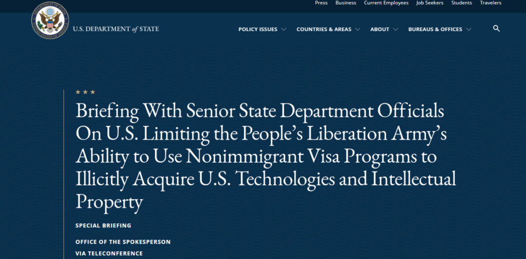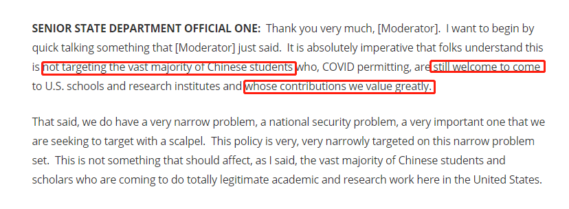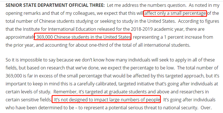 发布会上国务院的三位官员介绍了禁令出台的背景。国务院的官员特别指出:受影响的中国学生比例很低,绝大部分在读和即将赴美的中国学生不受影响。