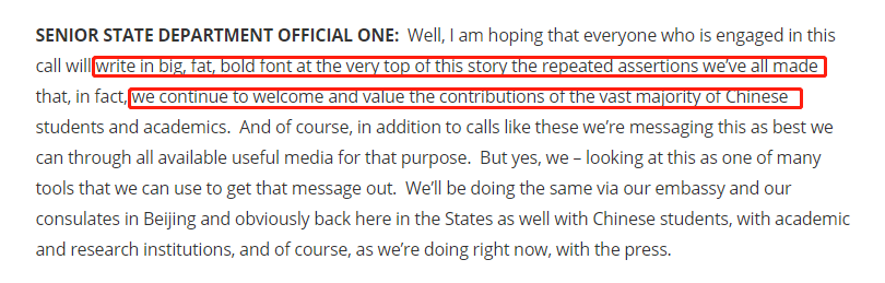 发布会上官员还告知媒体:我希望参与此发布会的每个人回去都可以在开头写下大号加粗的字体,事实上,我们继续欢迎并重视绝大多数中国学生和学者的贡献。我们还将通过所有可用的有用媒体尽力传递这一消息。