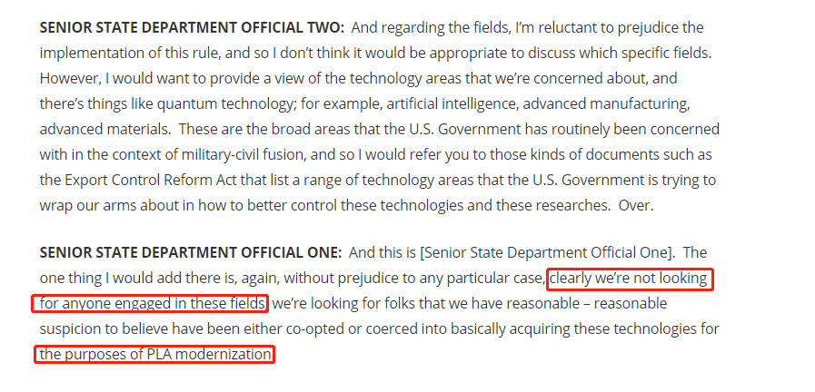 关于媒体所关注的是否有大学的名单,官员表示:“我们不大可能很快给出一个学校名单。我们会确定对中国军民融合战略中关键、重要的大学。我们会仔细研究,确定哪些是符合禁令。我们会尽力而为,以找出哪些人属于禁令的范围”。虽然无法给出具体的数字,但发布会上一再强调,受影响人群将极为有限。