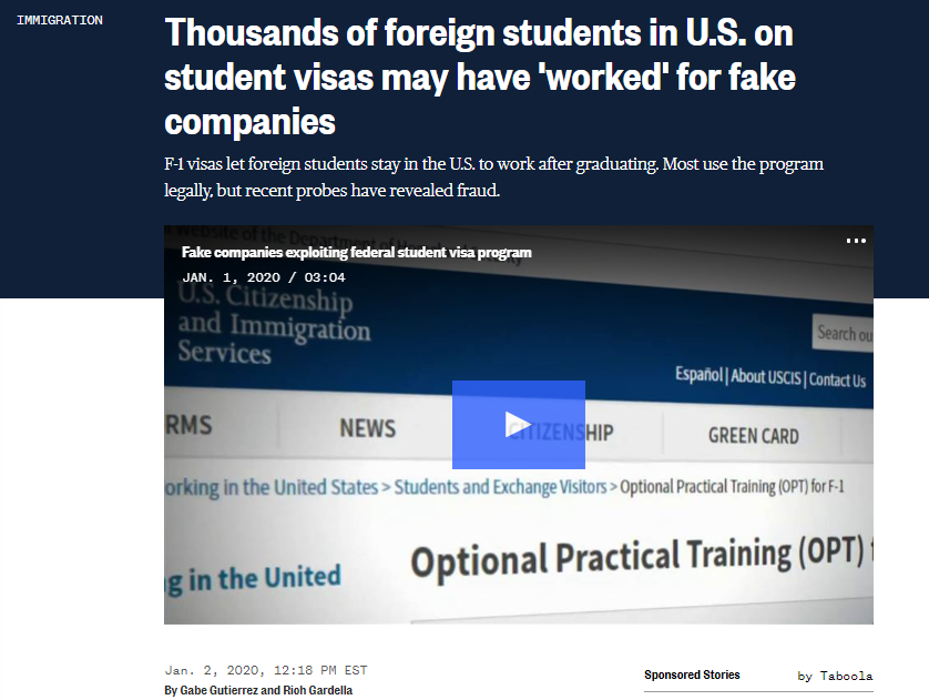 今年年初一则新闻称,2019年4月份NBC爆出一家为留学生提供挂靠OPT的公司,且老板已被刑事起诉。起诉书中称近2000名中国学生在这家公司进行过OPT“挂靠”。如今这些学生可能要面临被遣返,或者之后入境困难等问题。