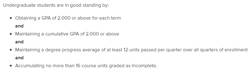 UCD的本科生如果想保持良好的学术成绩并顺利毕业,需要保持每一个学期的平均GPA在2.0或以上,累积平均GPA在2.0或以上。同时还需要保证每个学期完成至少12个学分的课程以及累积不超过16个学分的Incompletet。